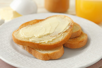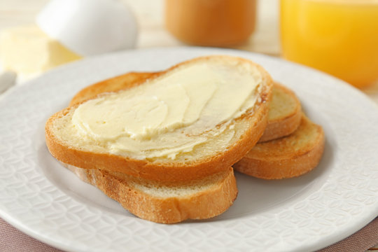 Whole wheat sliced bread with butter on wooden board, simple and rustic breakfast