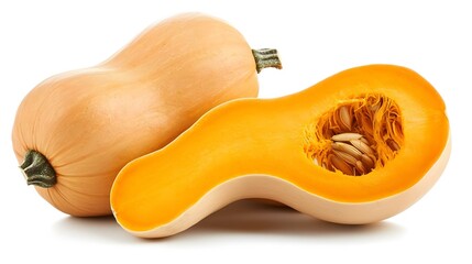 Halves of raw organic butternut squash with ingredients for making . Top view with copy space.