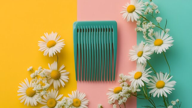 Green hair comb with daisies and buttery vanilla biscuits isolated on a colorful background