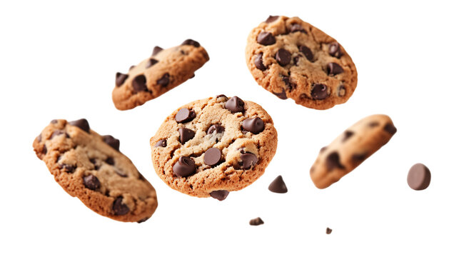 Delicious Chocolate Chip Cookies Floating and Falling Isolated on White Background
