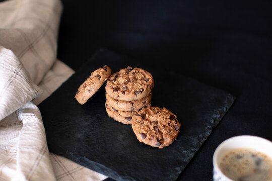 Stacked chocolate chip cookies on rustic wooden surface