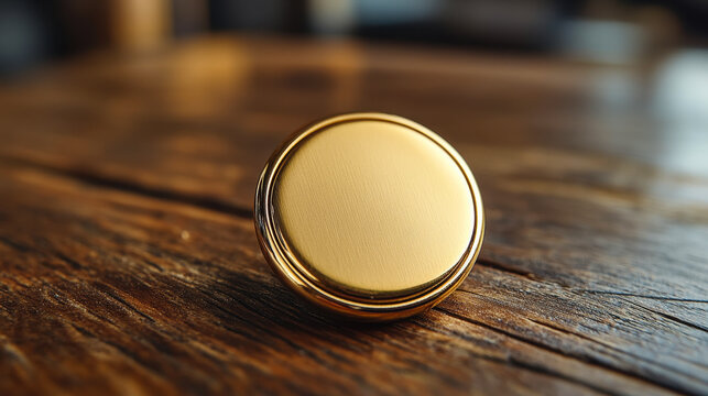 Golden Metal Pin Badge Button Mockup on Wooden Table, Round Brooch Template with Realistic Textured Design, Ideal for Branding and Customization Projects