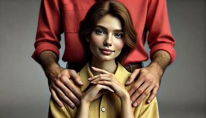 a young woman in a yellow button down blouse smiling and looking at the camera is supported by the hands of a man behind her in a red shirt