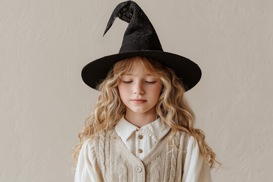 blonde little girl wearing a black witch's hat, white button up shirt, and knit vest