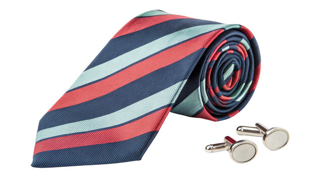 A mans dark tie, cufflinks, and cologne bottle isolated on transparent background