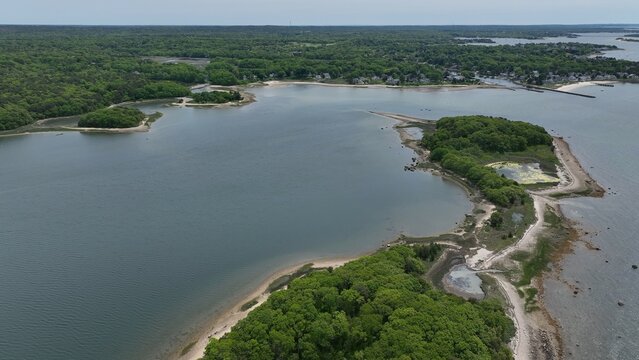 Aerial peaceful Massachusetts coastline with natural islands with beach and trees wildlife preserve in Buzzards Bay beautiful shoreline near Boston