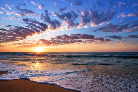 Tranquil winter coastline and ocean waves meeting sandy shore