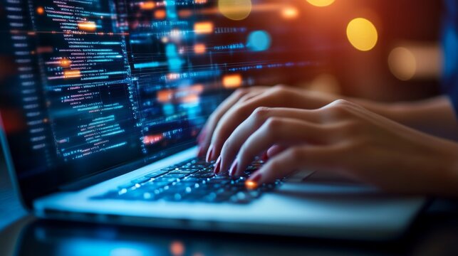 Hands Typing on Laptop with Code and Light Effects