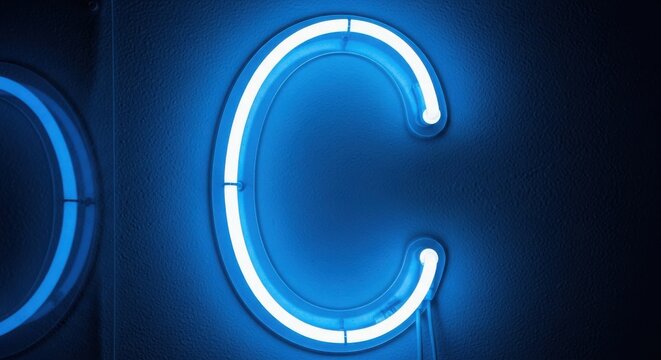 Glowing blue neon letter C on dark background