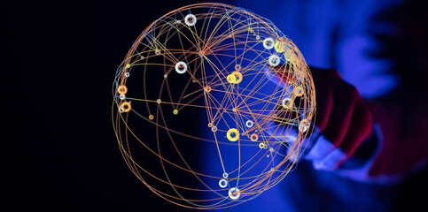 Abstract image of a glowing digital sphere representing a global network, with a hand touching the network. Ideal for concepts like c