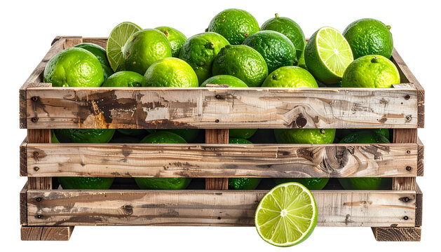 Wooden crate overflowing with fresh, green limes, some halved (1)
