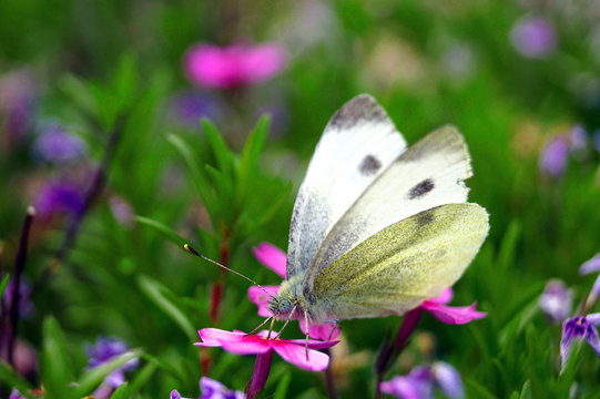 Butterfly, Cabbage White, Pieris rapae, on blooming purple Phlox subulata. Female European Large Cabbage White butterfly Pieris brassicae feeding on rose flower.