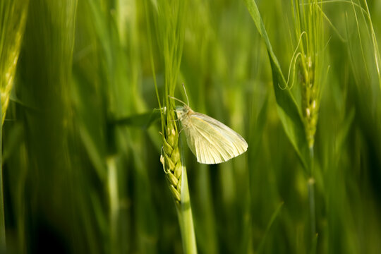 A white Pieris brassicae butterfly delicately perched on a green wheat spike, its wings slightly spread, revealing intricate details