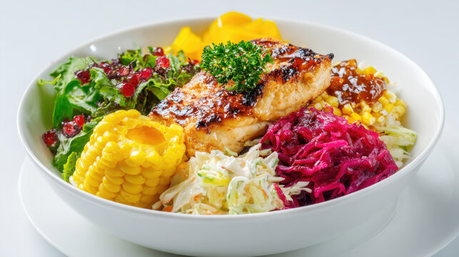 Healthy gourmet grilled salmon fillet poke bowl with fresh corn on the cob red cabbage slaw green salad with pomegranate seeds and creamy coleslaw served in a white ceramic bowl on a bright background