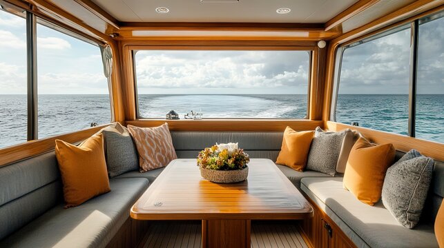 cabin cruiser with comfortable seating and a beautiful ocean backdrop
