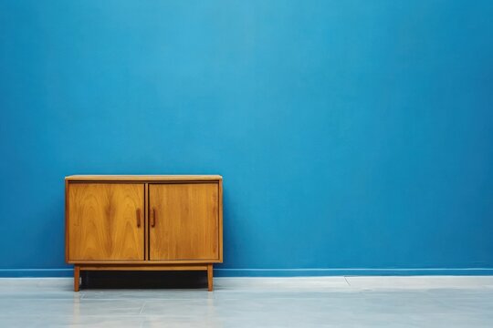Minimalist living room setup with a wooden cabinet and sleek side table, placed in front of a sophisticated blue wall, offering a clean and modern aesthetic