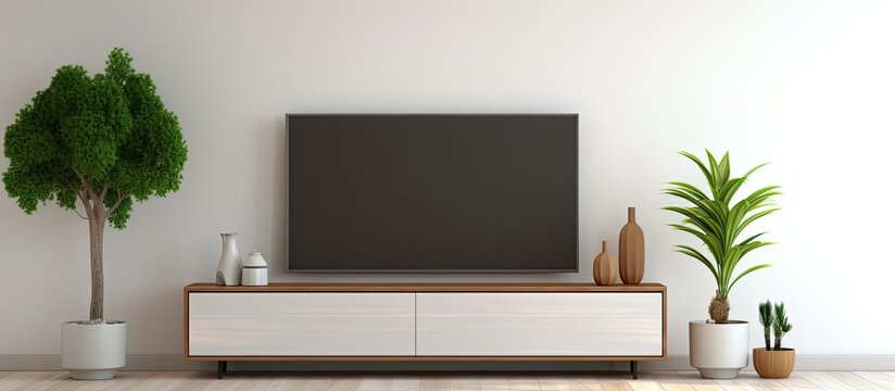 A white tv stand with a plant and a potted plant