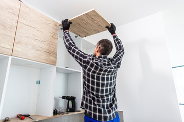 The carpenter sets the door of the kitchen shelves