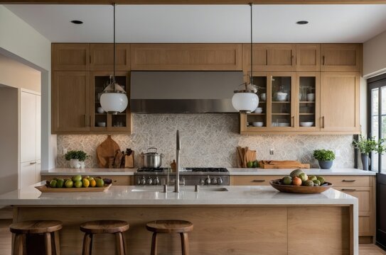 Holiday baking spread on farmhouse kitchen island with garland and warm wood cabinets