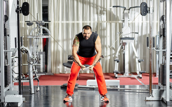 Cropped shot of a muscular bodybuilder doing bicep curls in cable crossover gym machine