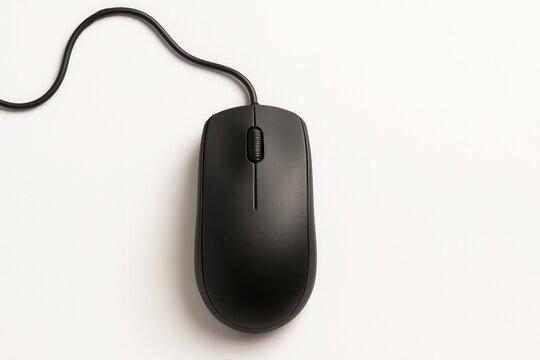 Black computer mouse on pure white background top down centered with gentle cable curl framing corner for technology product layout and design mockup
