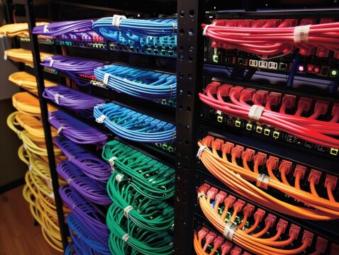 Colorful network cables neatly organized in a server rack within a data center, ensuring efficient network management and connectivity.