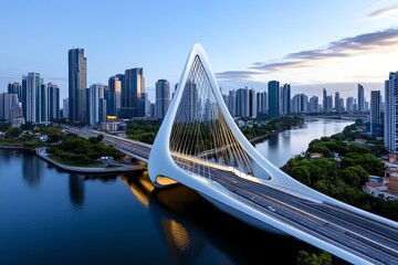 Bridge Cable-Stayed, Futuristic, and Panoramic visualized in an expansive cityscape where a cable-stayed bridge stretches across a river, its design sleek and futuristic against the skyline