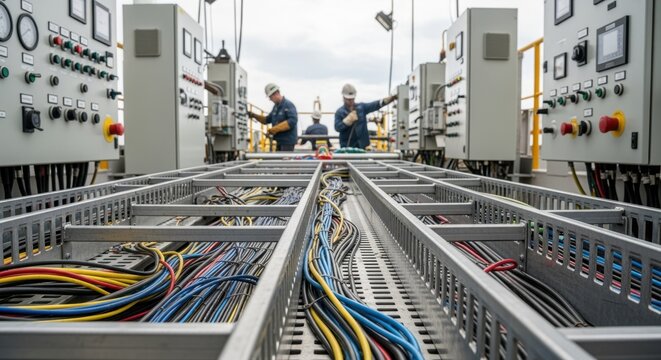 Power cables and instrument cables in the trays with piping construction for duty industry concept
