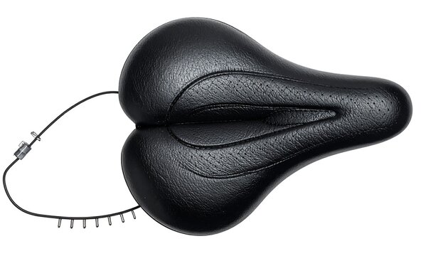 Overhead shot of a black bike saddle, designed with a split seat, perforated texture, and a connecting cable system