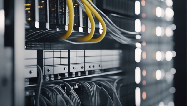 Advanced tech servers with illuminated data connectors show active data transfer. High tech network system with complex structured hardware. Modern tech infrastructure displays complexity, efficient