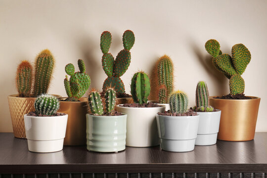 Many different beautiful cacti on wooden table