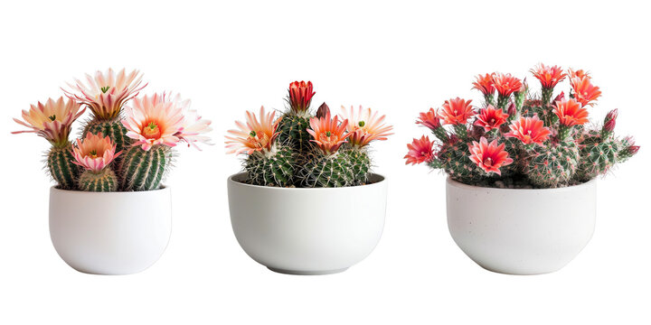 Set of striking cactus with blooming flowers in a modern pot, isolated on transparent white background