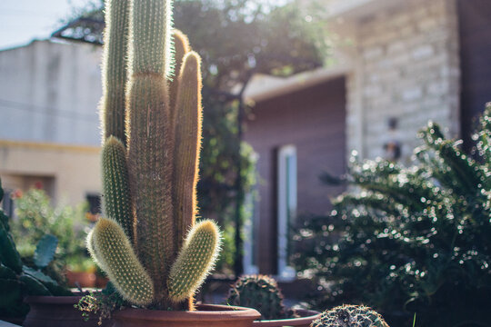 Charming Mini Cactus in a Grey Pot on Table with Various Cacti in Background and Ample Space for Creative Text Placement