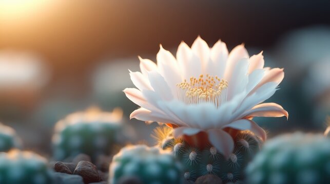 This image presents a stunning cactus flower fully blossomed, highlighting its elegant petals, illuminated by the warm glow of a setting sun over arid terrain.