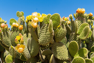 Profile view of  Prickly Pear cacti fruit with vibrant orange flowers blooming. Green prickly pear fruit under the flowers.