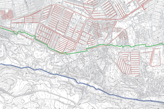Imaginary cadastral map of territory with buildings, roads and land. Autocad drawing version of any region in Istanbul, Turkey.