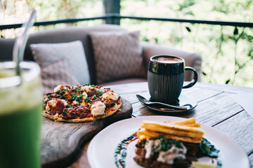 Cozy urban cafe interior bathed in natural light with wooden furniture, large windows, and inviting decor creating a warm atmosphere for relaxation and enjoyment