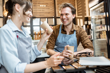 Couple of a young cafe workers have some business conversation while sitting with coffee at the table of their cafe or pastry shop