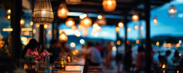 Evening atmosphere at cafe terrace with blurry silhouettes and warm lighting