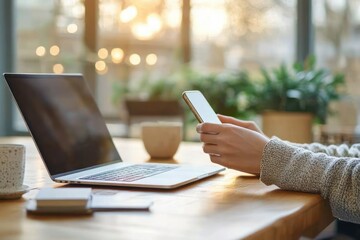 Asian Woman Working on Laptop and Smartphone in Bright Cafe Environment