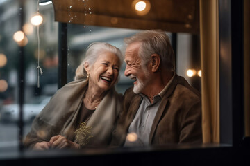 Elderly couple sharing a laughter at a cafe window