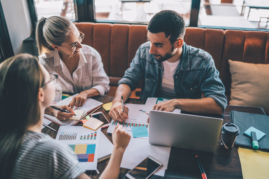 Young employees having discussion of online project in cafe
