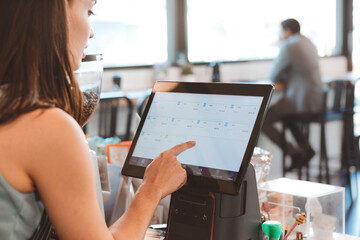 customer self service order drink menu with tablet screen at cafe counter bar,seller coffee shop accept payment by mobile.digital lifestyle concept.Blank space for display of design.