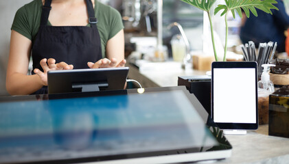 Cashier staff using tablet to receive orders from customers at counter service in cafe or store. Cashier takes payment from customer with digital tablet.