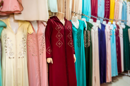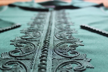 Moroccan traditional dress, embroidery on the caftan. Festive women's clothing in Morocco