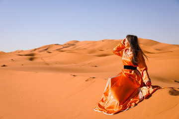 A girl in a beautiful Moroccan dress. Merzouga Morocco.