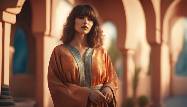 A women wear Moroccan Caftan Dress with background ai generative