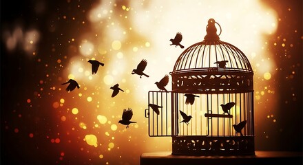 Birds flying out of an open antique bird cage at night