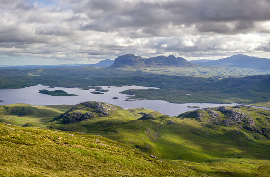 Views of the summits of Suilven, Caisteal Liath with Loch Sionasgaig below from the summit of Stac Pollaidh in the Scottish Highlands on a sunny summers day with dramatic clouds in the UK