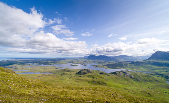 Views of the summits of Suilven, Cul Mor and An Laogh with Loch Sionasgaig and Loch an Doire Dhuibh below from the summit of Stac Pollaidh in the Scottish Highlands on a sunny summers day in the UK